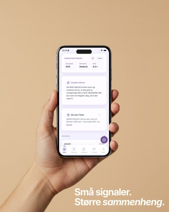 – Dette er det vi bygger med Thylo. Den setter små signaler fra kroppen i sammenheng med symptomer og prøvesvar – slik at folk kan få verdifull innsikt og forstå mønstre i stoffskiftet sitt over tid. Vi skal ikke bare være en helseapp som gir rådata uten sykdomskontekst. Vi skal være en digital plattform for stoffskiftepasienter. Et sted å samle alt. Appen analyserer mønstre i brukerens data og gir ikke-medisinske innsikter og refleksjoner. Disse kan hjelpe brukeren å forstå hva som påvirker dagsformen, og forberede bedre samtaler med legen.